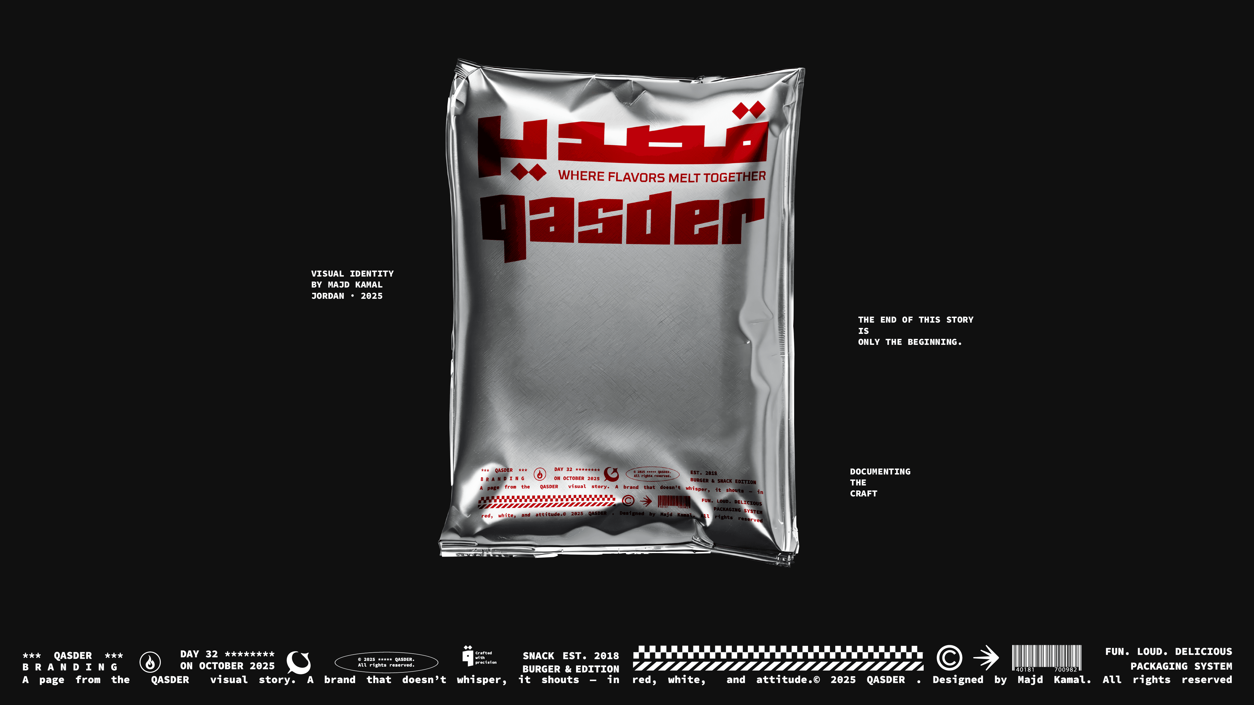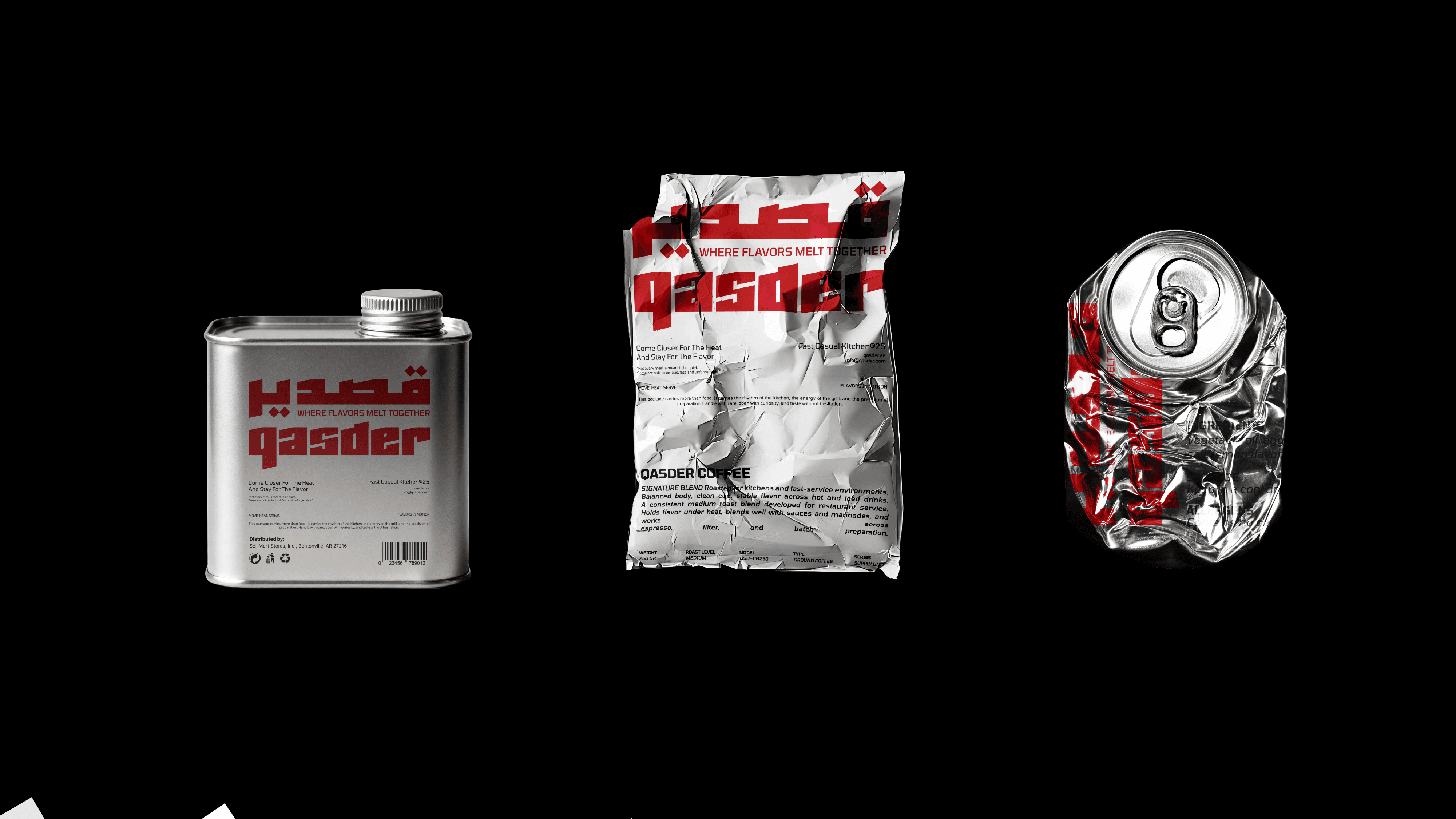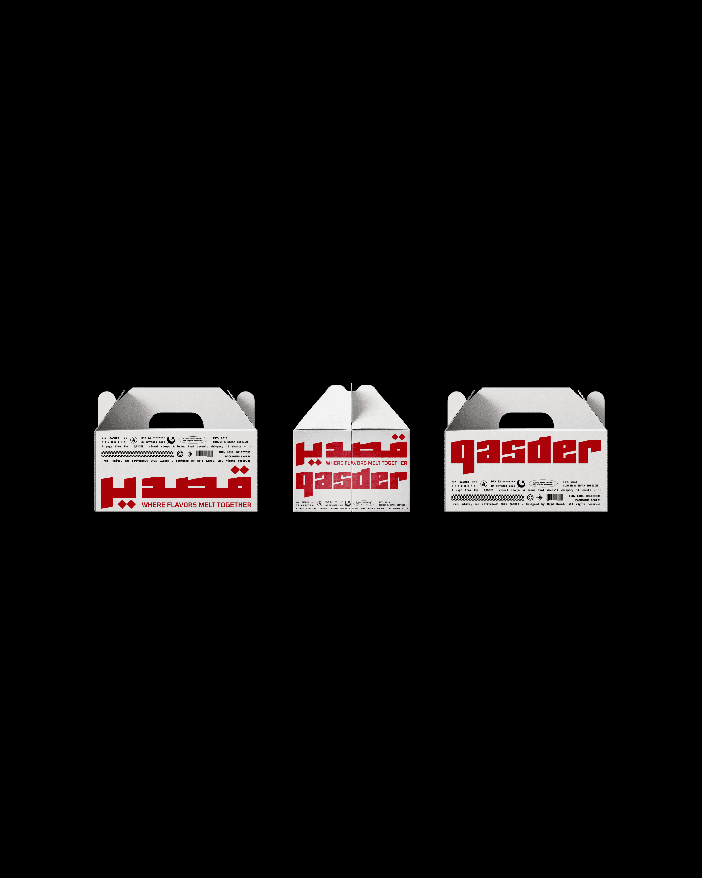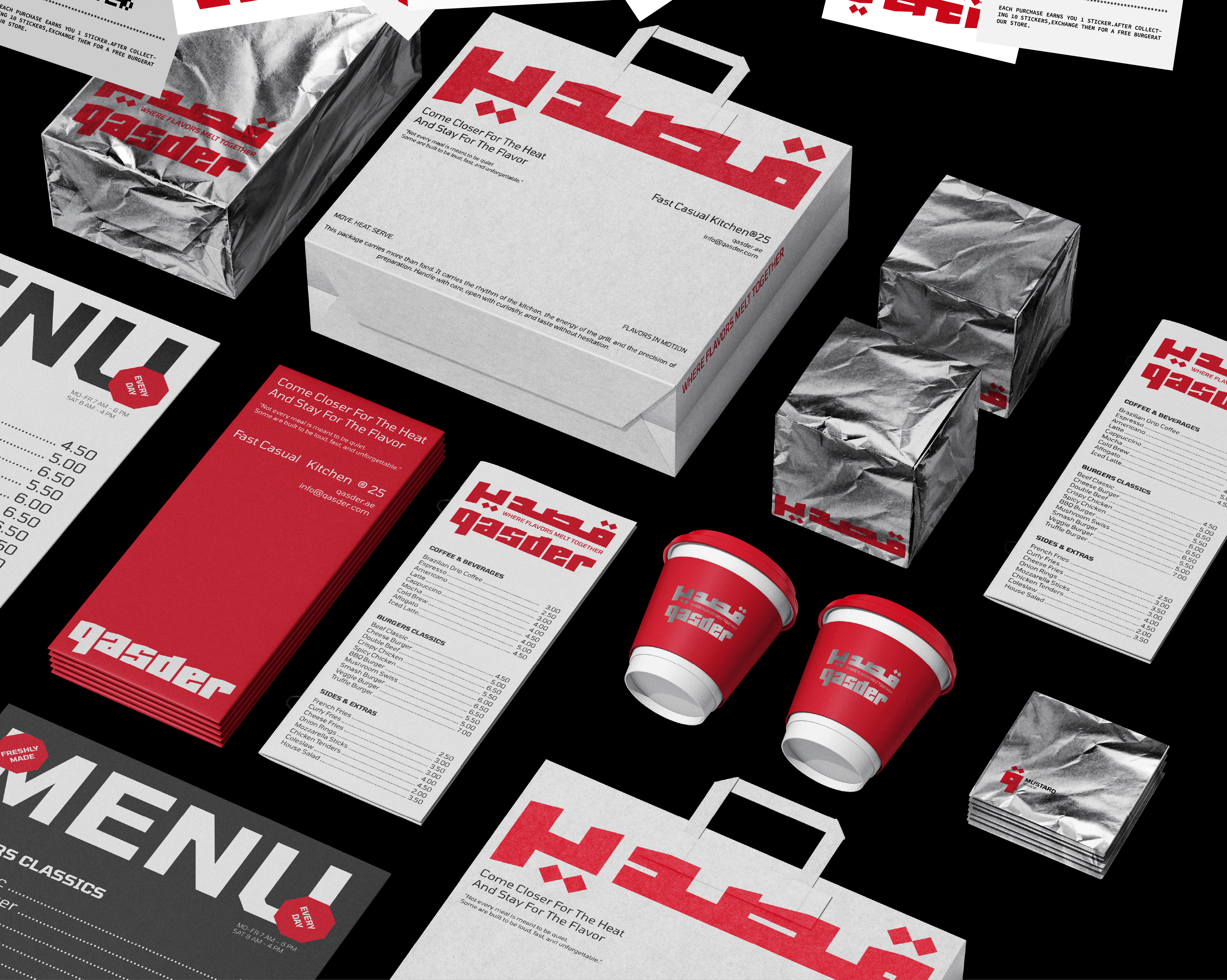 QASDER is a fast-casual kitchen concept shaped by heat, movement, and material honesty. The identity draws inspiration from foil wrapping, a visual language deeply connected to street food culture and contemporary takeout rituals. The reflective, crinkled surface becomes more than a packaging choice, it evolves into a graphic metaphor for freshness, warmth, and immediacy. This material reference informed the angular logotype, the modular pattern system, and the overall tactile direction of the brand, creating a cohesive experience that feels raw, energetic, and unmistakably urban.