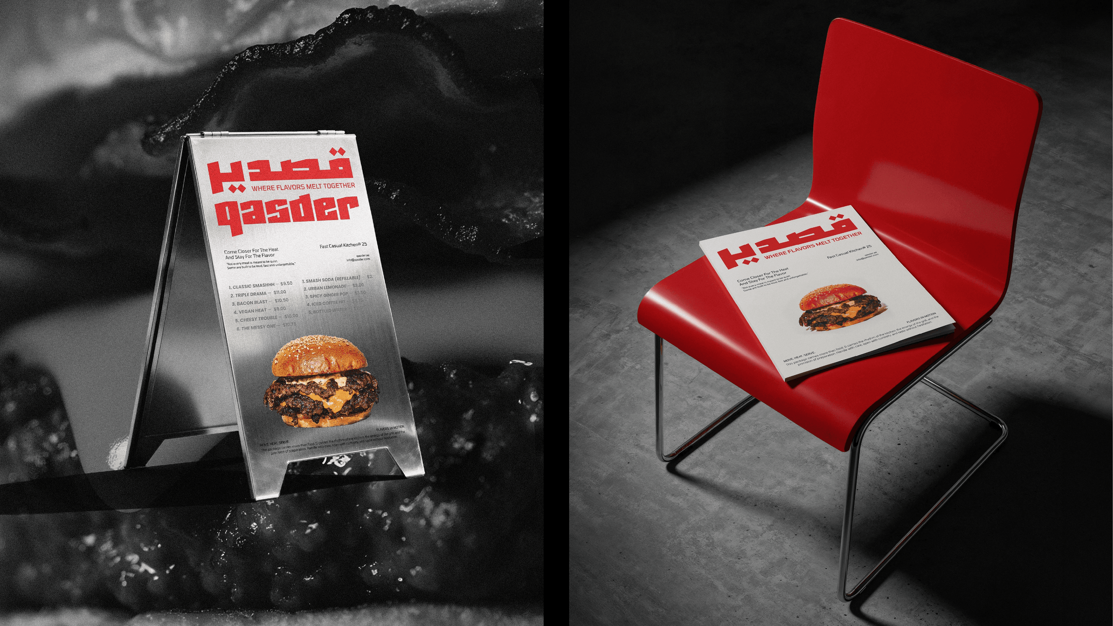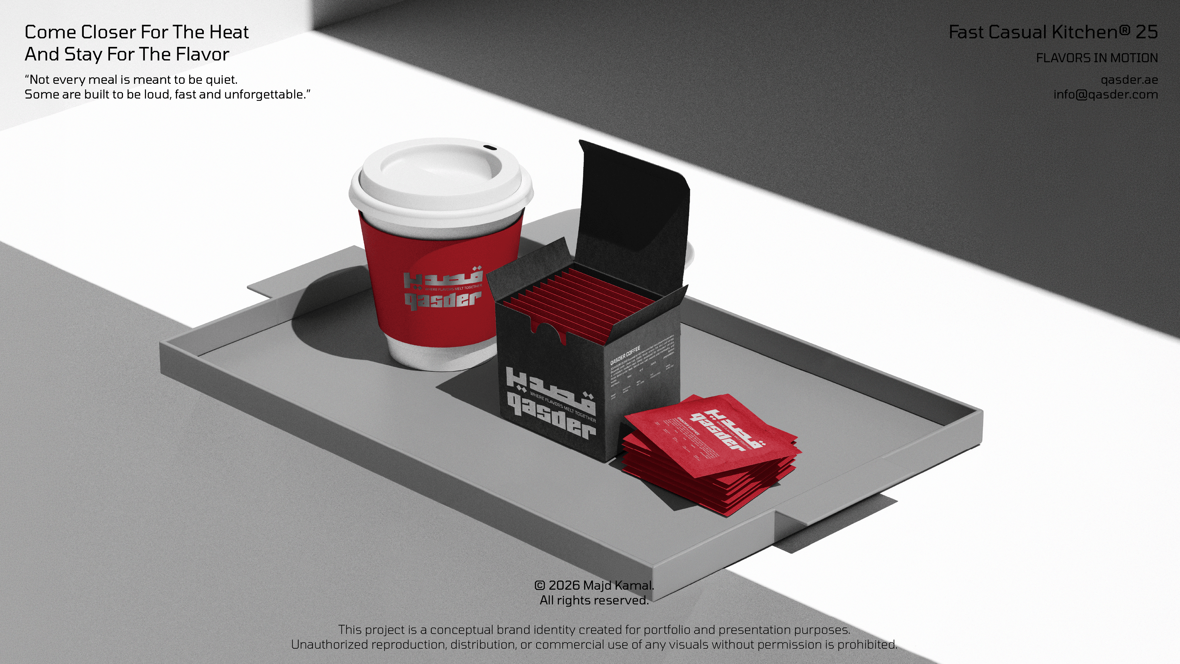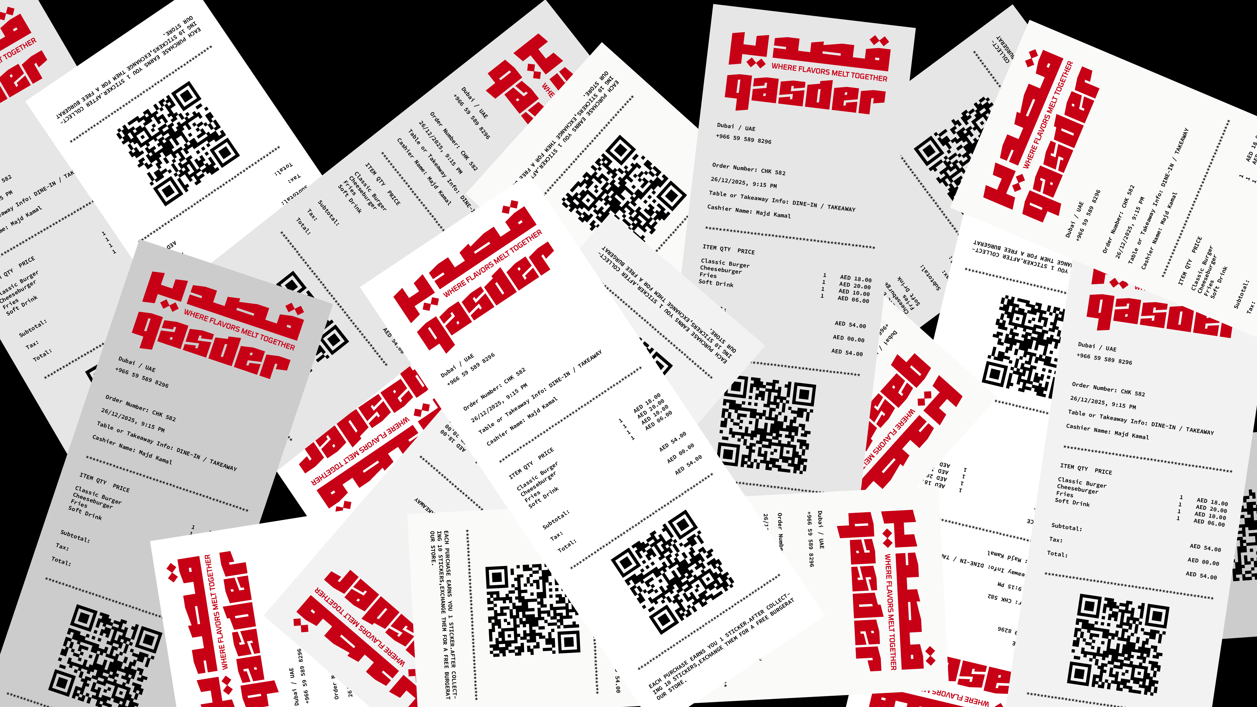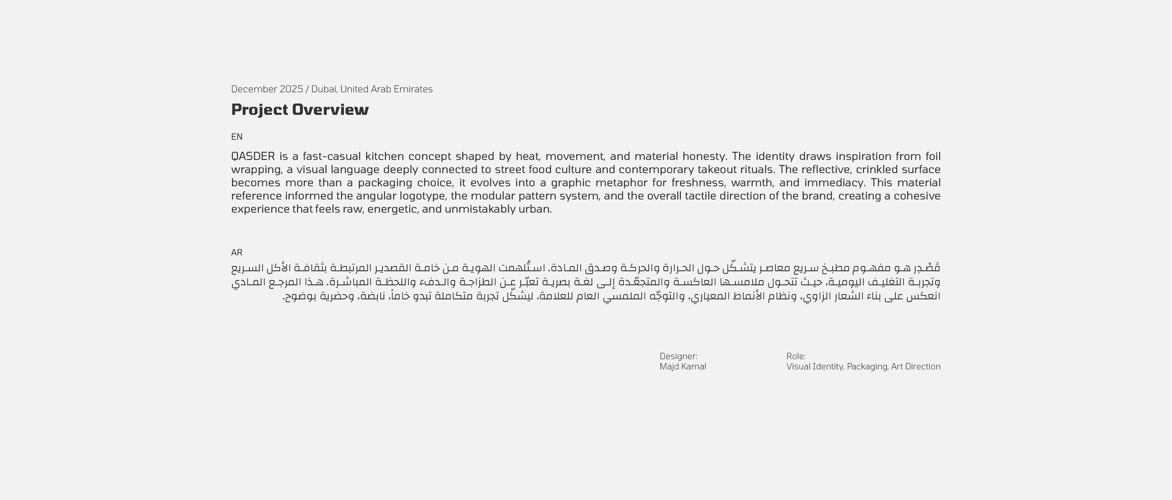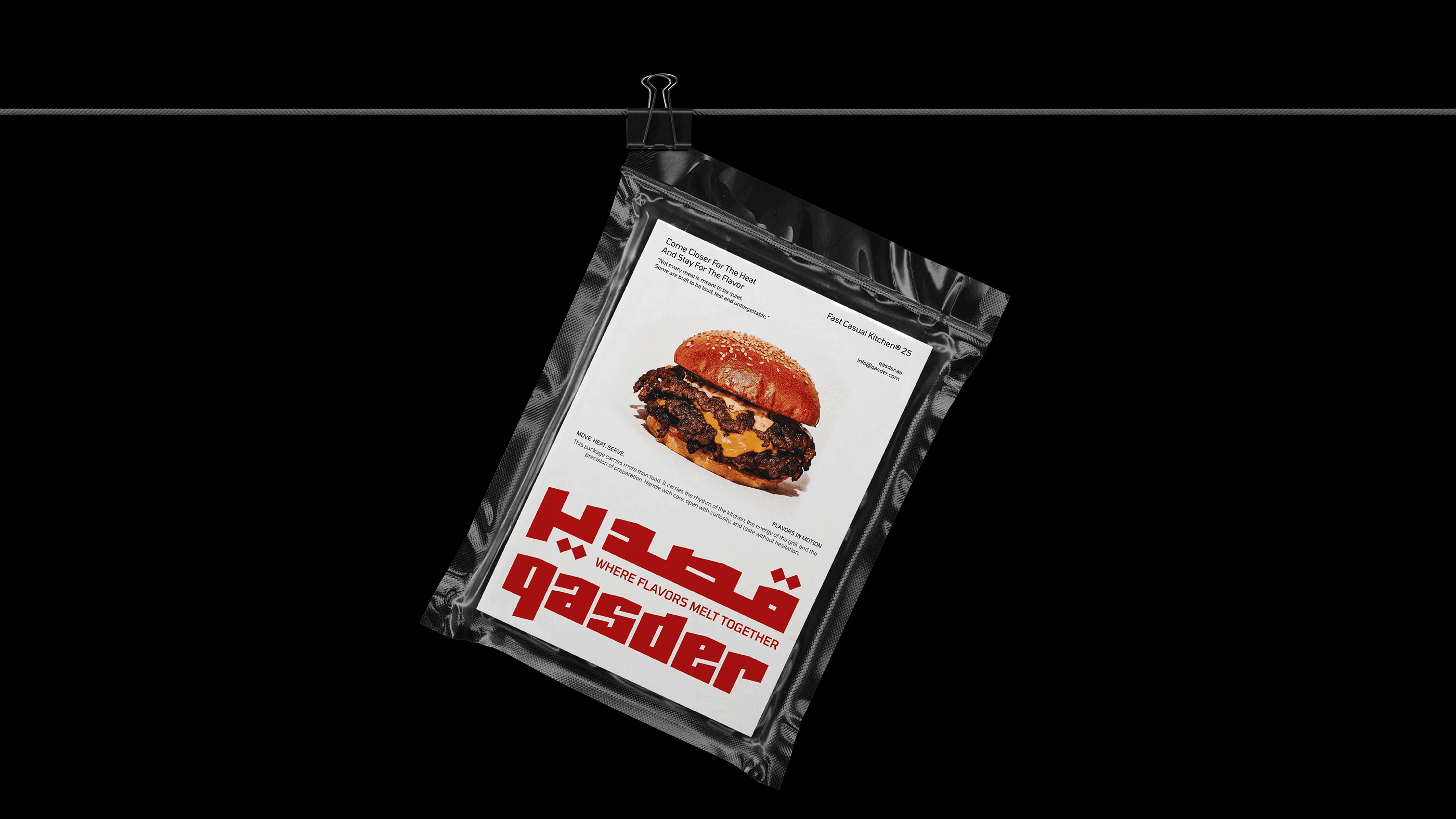 QASDER is a fast-casual kitchen concept shaped by heat, movement, and material honesty. The identity draws inspiration from foil wrapping, a visual language deeply connected to street food culture and contemporary takeout rituals. The reflective, crinkled surface becomes more than a packaging choice, it evolves into a graphic metaphor for freshness, warmth, and immediacy. This material reference informed the angular logotype, the modular pattern system, and the overall tactile direction of the brand, creating a cohesive experience that feels raw, energetic, and unmistakably urban.