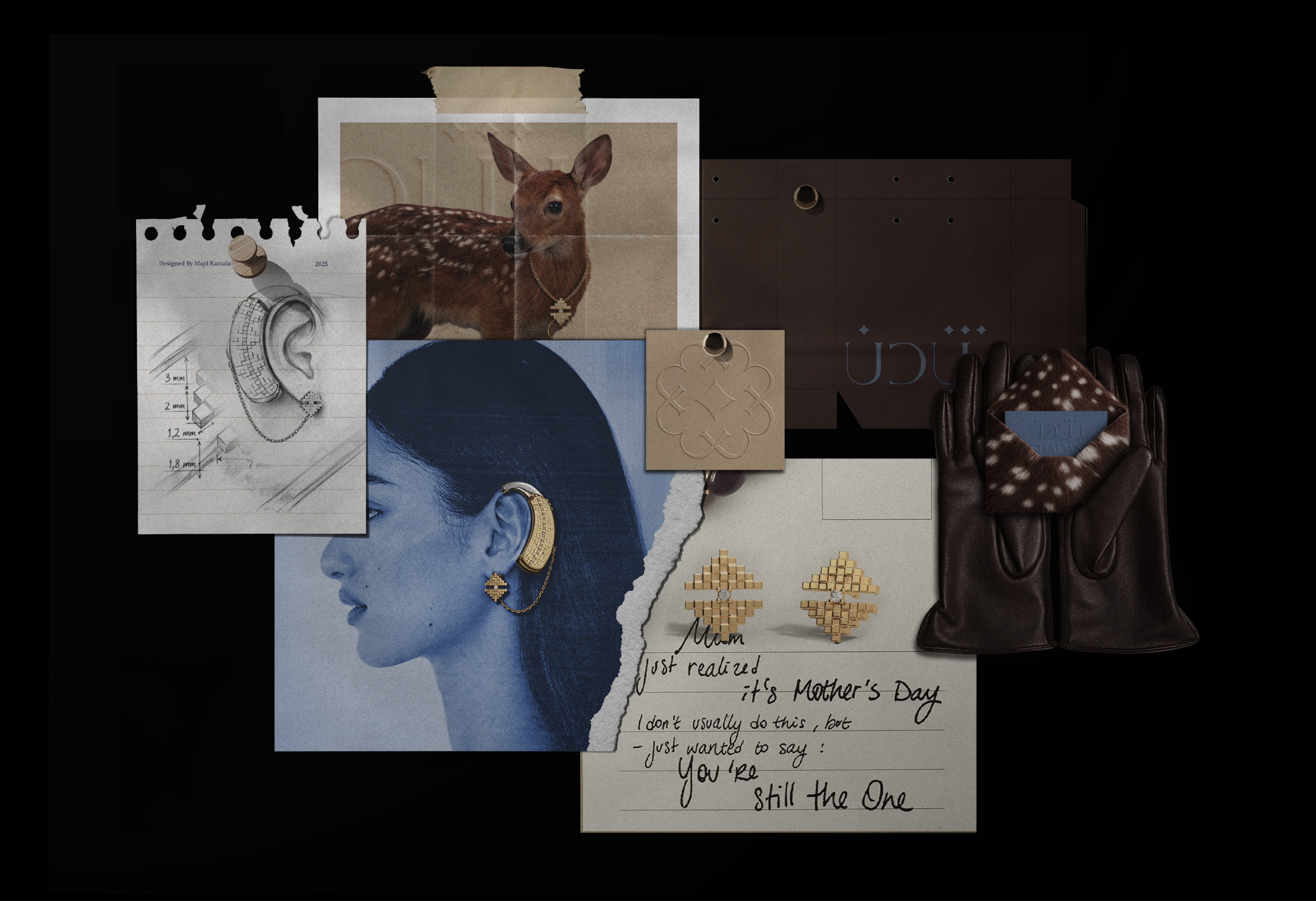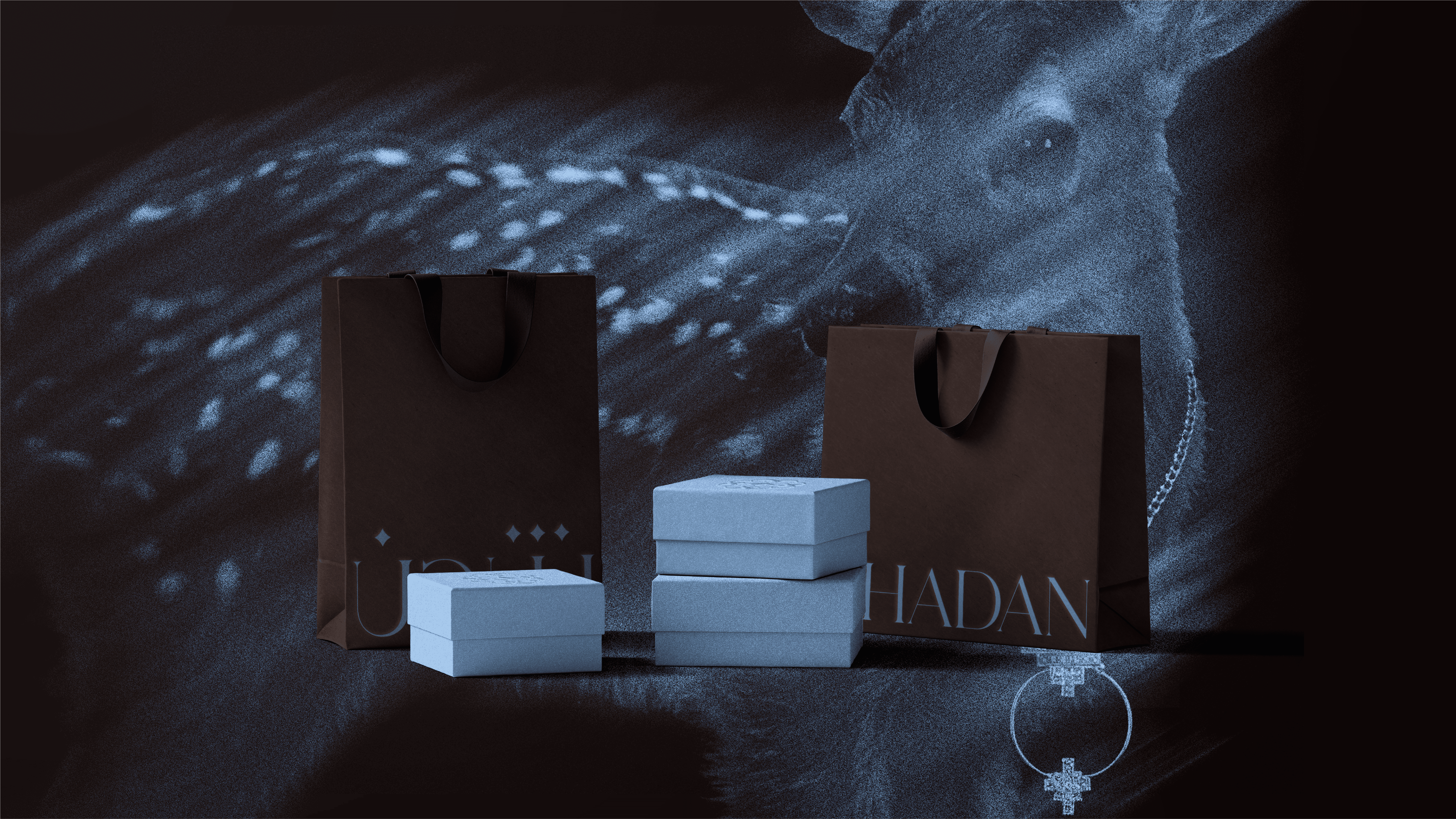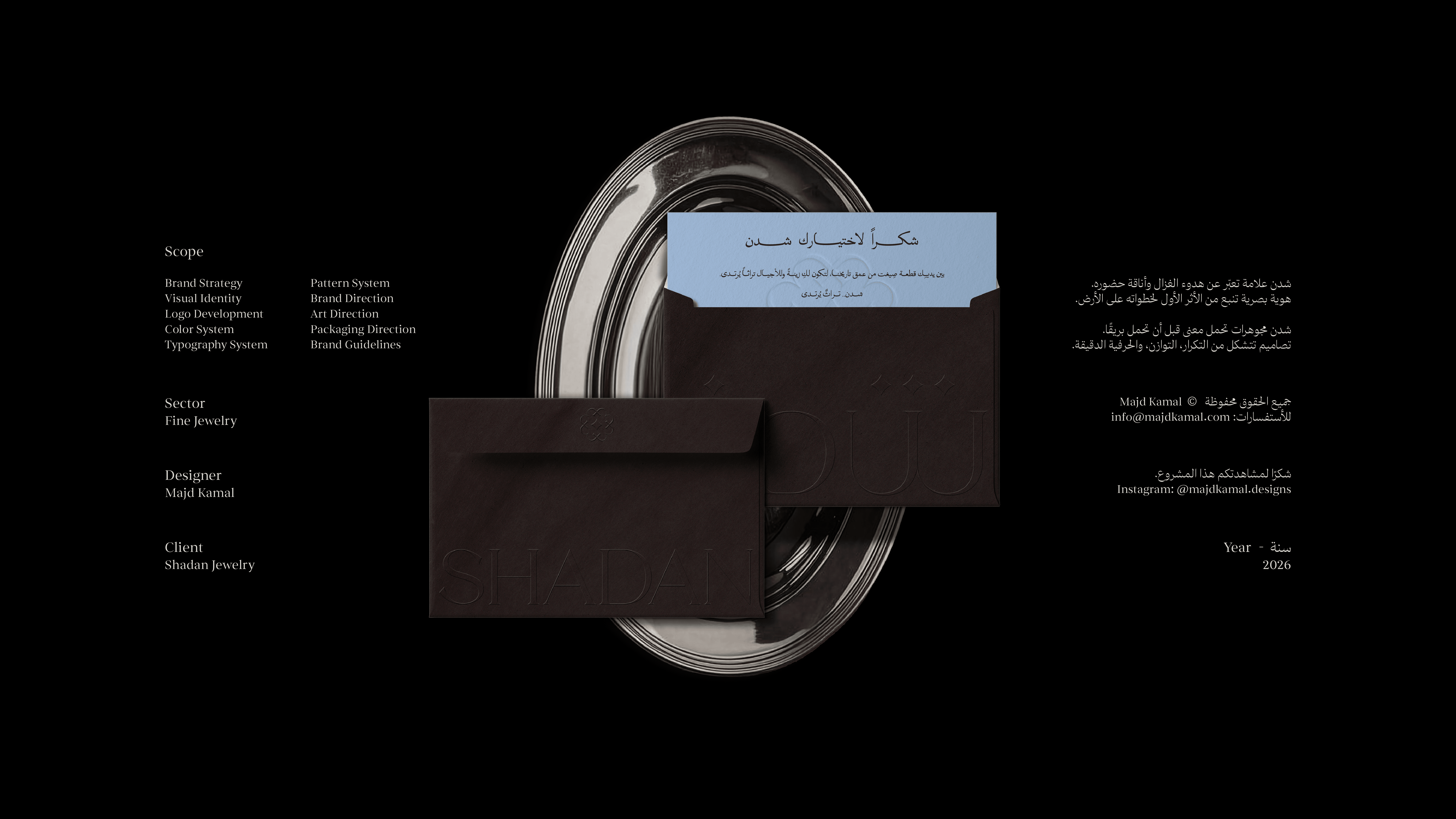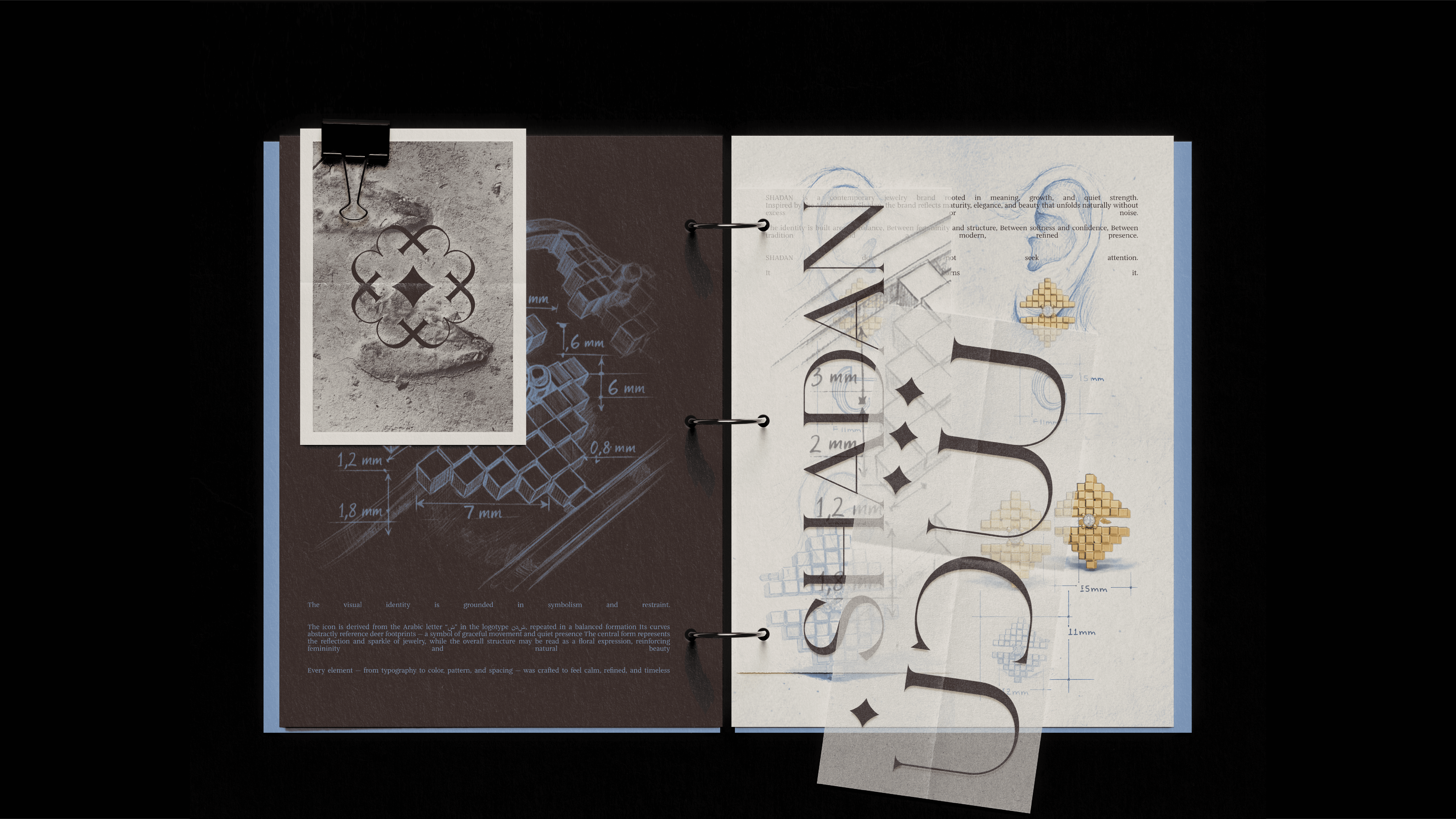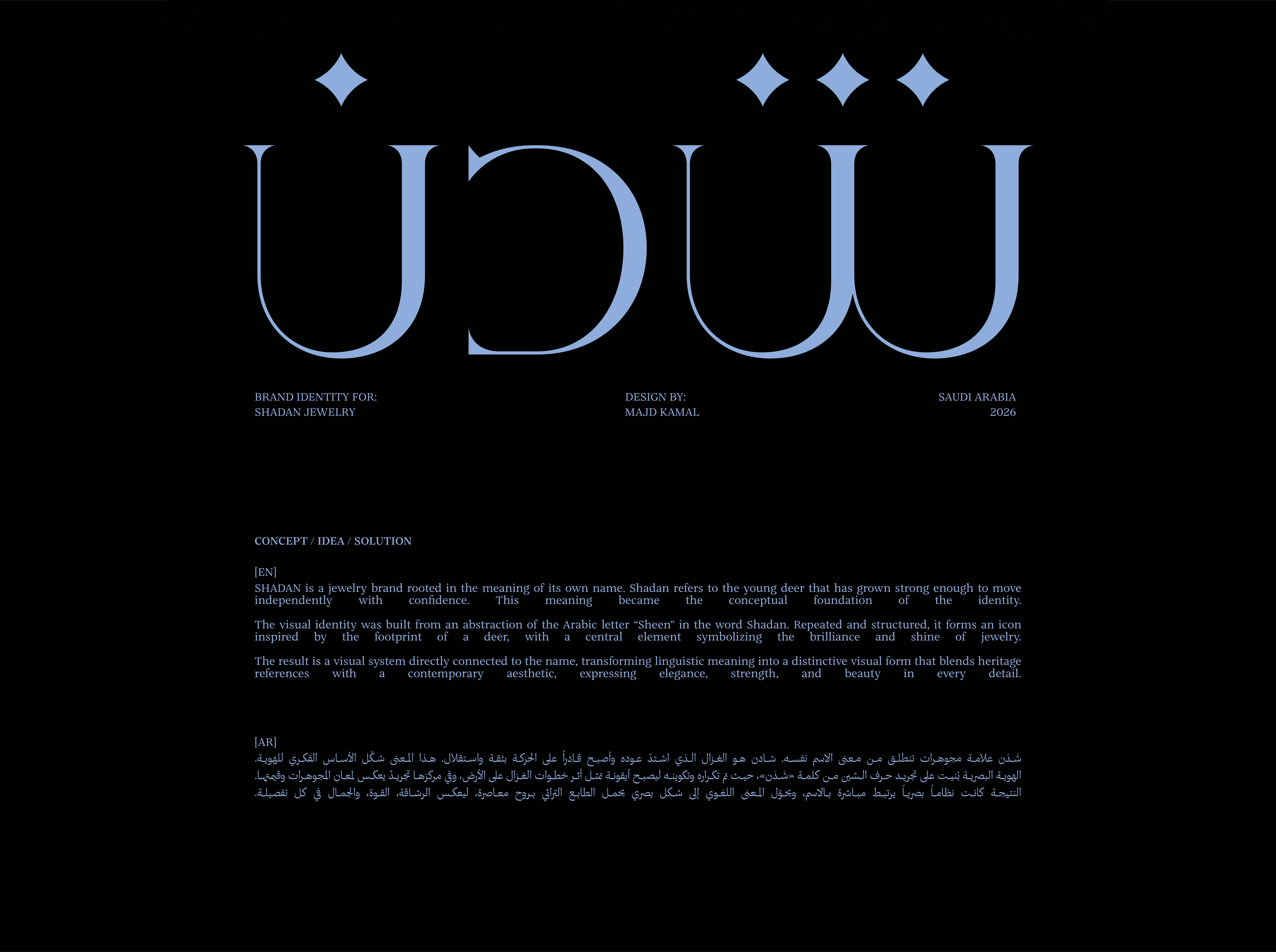 SHADAN is a jewelry brand rooted in the meaning of its own name. Shadan refers to the young deer that has grown strong enough to move independently with confidence. This meaning became the conceptual foundation of the identity. The visual identity was built from an abstraction of the Arabic letter “Sheen” in the word Shadan. Repeated and structured, it forms an icon inspired by the footprint of a deer, with a central element symbolizing the brilliance and shine of jewelry. The result is a visual system directly connected to the name, transforming linguistic meaning into a distinctive visual form that blends heritage references with a contemporary aesthetic, expressing elegance, strength, and beauty in every detail.